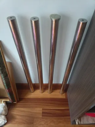 Juego de cuatro patas de acero inoxidable para mesa. Añaden un toque moderno y elegante a cualquier mueble. 79 cms alto, 4 cms ancho, están preparadas para roscar pieza, una de ellas tiene pieza pero tiene que ser más grande. - Fabricadas en acero inoxidable. - Diseño cilíndrico. - Acabado pulido.