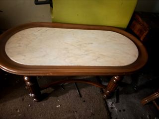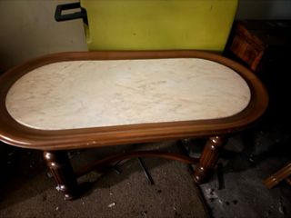 Elegante mesa baja con un diseño clásico y atemporal. Su superficie de mármol le da un toque sofisticado. - Encimera ovalada de mármol. - Base y estructura de madera. - Patas con detalles tallados.