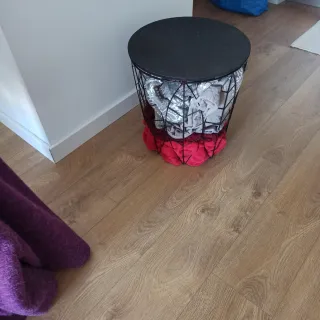 Mesa auxiliar con un diseño moderno y funcional. Perfecta para cualquier rincón de tu hogar. - Tapa redonda negra. - Estructura de metal. - Cesta inferior almacenaje