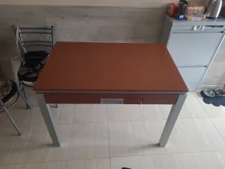 Mesa de cocina con un diseño moderno y funcional. Perfecta para tu día a día. - Tablero de madera pintada en tono marrón. - Patas y estructura de metal en color plateado. - Cajón integrado con tirador. 70x78x110 y abierta hace 179