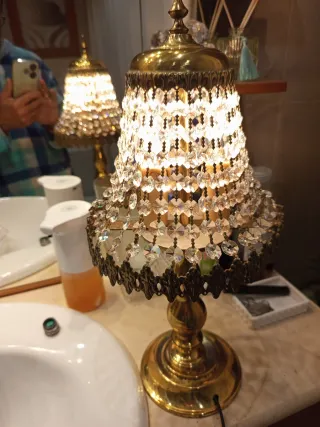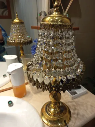 Elegante lámpara de mesa de estilo antiguo. Su diseño combina metal y cristal para un toque sofisticado. - Base y estructura en tono dorado. - Pantalla adornada con cristales transparentes. Amy 1966