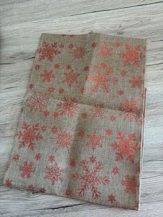 Camino de mesa de Navidad, con diseño de copos de nieve en color rojo y base en tono beige. Largo: 180 cm.