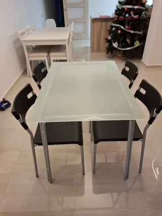 Conjunto de mesa de comedor IKEA Ekedalen de color blanco con cuatro sillas Bergmund (opción a un total de 6 sillas). Opción de compra por separado: Mesa: 100€ Sillas: 55€/unidad Se vende por cambio de decoración. Muy poco uso. La mesa tiene un par de marcas de montaje (ver fotos) y las sillas están perfectas, ya que se han usado en contadas ocasiones. Sillas con funda lavable color orrsta gris claro. 📏Medidas: Mesa Ekedalen Longitud: 120cm (extensible a 180cm) Ancho: 80cm Altura: 75cm Precio original: 149€ Silla Bergmund con funda orrsta gris claro Alto: 95cm Ancho: 52cm Profundidad: 52cm Precio original: 79€