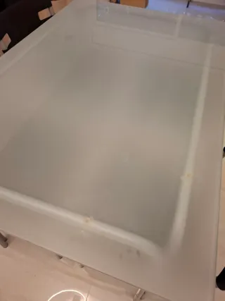 Mesa Ikea rectangular con superficie de cristal templado traslúcido y patas de metal gris. Se desmonta fácil y el crital se agarra a las patas mediante ventosas. Largo 110 cm, ancho 75 y altura 73.
