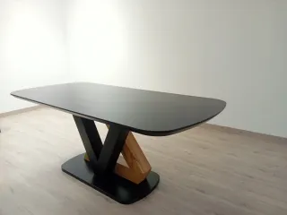 Mesa de comedor con un diseño moderno y robusto. Combina la madera con el color negro. - Tablero de madera con acabado natural. - Patas también de madera en forma de X.
