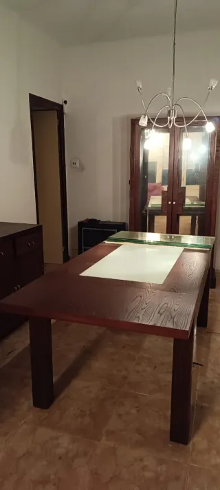 Mesa de comedor de madera con un diseño clásico y elegante. Perfecta para reuniones familiares o con amigos. - Medidas cerrada: 2m largo x 85cm ancho. - Acabado natural de la madera. Taula menjador. Tancada 2m llarg x 85cm amplada. Oberta 3,20m oberta de llargada . Conjunt de 6 cadires