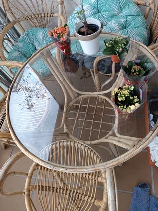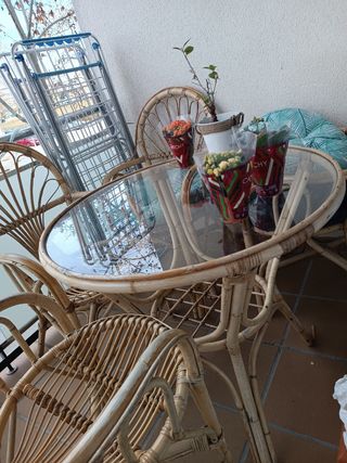 Conjunto de mesa y sillas de bambú con un diseño natural y elegante. La mesa cuenta con una superficie de cristal. - Materiales: Bambú y cristal. - Color: Tonos marrones y transparente.