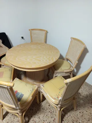 Conjunto de mesa redonda y seis sillas con un diseño elegante y materiales de calidad. - Mesa con sobre de madera y base de ratán. - Sillas de ratán con asientos tapizados en tonos amarillos y motivos decorativos.
