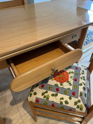 Conjunto de mesa de cocina extensible con cuatro sillas. - Mesa extensible de madera. - Sillas de madera con asientos estampados.
