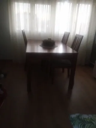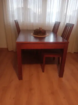 Mesa de comedor de madera con un diseño elegante. Regalo 3 sillas. Abierta mide 2 metros - Acabado en tono marrón oscuro. - Patas robustas para mayor estabilidad.