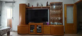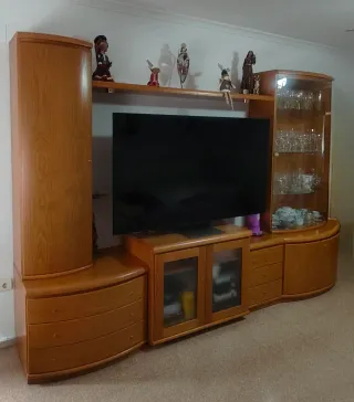 Conjunto de muebles de salón con una mesa de comedor y sillas. - Mesa de madera maciza con diseño rústico. - Sillas de madera a juego con respaldo curvo. -mueble de televisión con gran espacio de almacenaje. Medidas 2,40x45x91