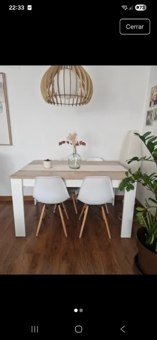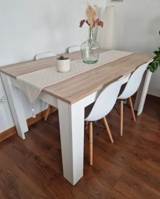 Mesa de comedor extensible en blanco y madera. - Medidas base: 120x80 cm. - Extensible hasta 180 cm. - Nunca se ha usado - Precio de compra 445€ (demostrable). Se vende por 150€, por su falta de uso