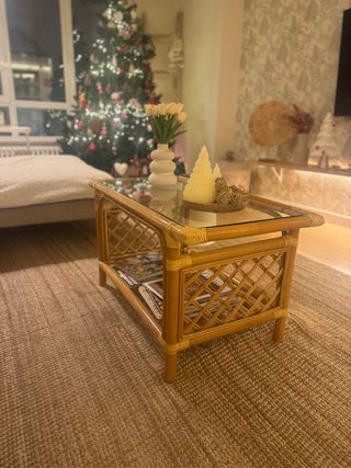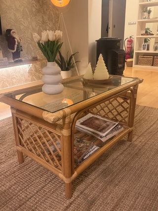 Mesa de centro y aparador con estructura de bambú y tapa de cristal - Diseño de ratán tejido en los laterales. - Estante inferior para almacenamiento. - Patas de bambú robustas.