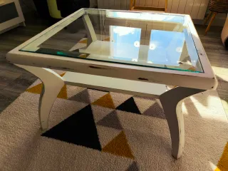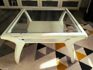 Elegante mesa de centro con un diseño moderno y funcional. Combina a la perfección la transparencia del cristal con la calidez de la madera. Precio negociable. - Superficie de cristal. - Base de madera. - Estructura blanca, efecto desgastado,vintage