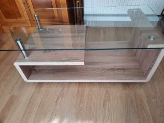 Mesa de centro elevable de alta calidad, muy robusta y funcional, ideal para salón. Longitud: 110cm altura 45cm altura desplegada: 59cm -Tapa elevable, perfecta para comer, trabajar con el portátil o usar como mesa auxiliar -Acabado en madera oscura (wengué) con cristales blancos integrados -Amplio espacio de almacenaje interior + estante inferior -Diseño moderno y elegante, combina con sofás claros u oscuros -Muy estable y resistente En muy buen estado, solo presenta leves marcas normales del uso. Se vende por reforma de la vivienda. ( se venden todos los muebles de la casa)