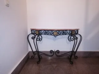 Elegante mesa de forja con un diseño clásico y detalles dorados. Su tapa de mármol le da un toque sofisticado. - Estructura de metal forjado. - Encimera de mármol. - Adornos metálicos dorados.