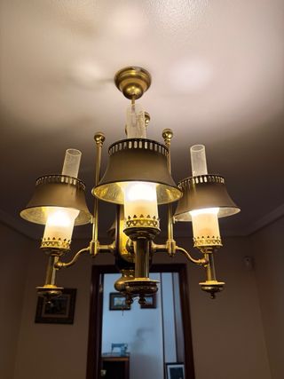 Juego de dos lámparas metálicas, una de techo y otra de mesa, con un diseño clásico y acabados en dorado. Aporta un toque de distinción a cualquier estancia. - Estructura principal de metal. - Detalles en cristal. 40€ por las dos.