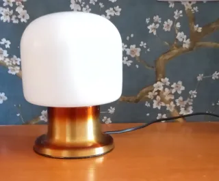 Lámpara vintage de mesa dorada y blanca.