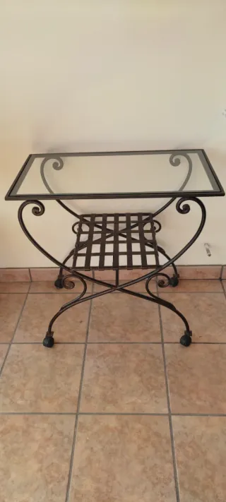Elegante mesa auxiliar con estructura de forja y sobre de cristal. - Diseño con detalles curvos. - Base con rejilla. - Ruedas para fácil movilidad. - Altura 68 - Ancho 40 - Largo 70