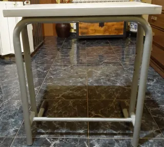 Mesa de estudio con estructura metálica y superficie gris Se venden juntas o por separado a 10 euros la unidad. No sé hacen envíos.