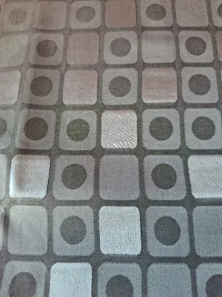 Elegante camino de mesa con un diseño geométrico de cuadrados y círculos del gato pretto. - Tonos plateados. - Acabado brillante en algunas áreas. - Detalle de borla en extremos. 1,80 x 40