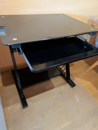 Elegante mesa con superficie de cristal y patas de metal. - Diseño moderno y minimalista. - Patas robustas para mayor estabilidad. - Acabado en tonos grises y transparentes. Lleva un pequeño desperfecto en el cristal como se ve en la foto. Precio negociable. Urge vender.