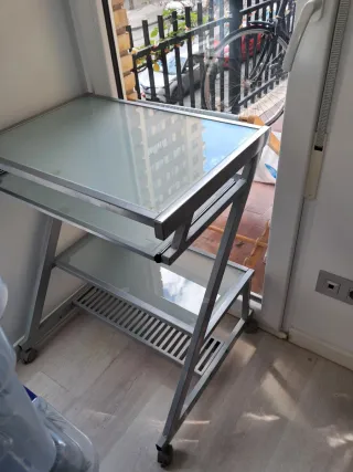 Mesa de estudio con un diseño moderno y funcional. - Superficie superior de cristal. - Bandeja extraíble. - Estructura de metal. - Ruedas para fácil movilidad.