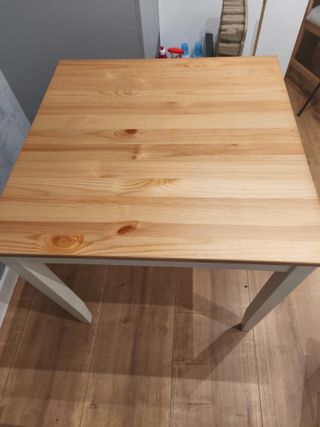 Mesa de comedor de tapa blanca y patas de madera de tono claro. - Tablero de color blanco, en buen estado. (Con una pequeña marca como se aprecia en la foto) - Patas de madera. - 120x70 - Dos extensiones de fabricación casera de 40x70. Lo que alarga la mesa hasta los 2m