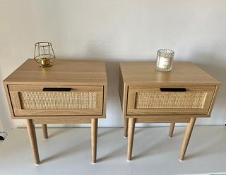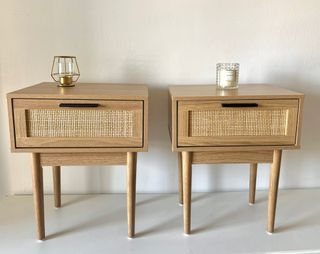 2 mesitas de noche de madera con un cajón y un espacio inferior extra. No se venden por separado.
