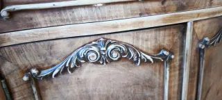 Conjunto de mesita de noche y cabeceros antiguos, fabricados de forma artesanal. - Diseño clásico y elegante. - Elaborado en maderas de nogal y castaño - Tiradores ornamentales de bronce.