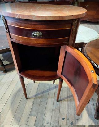 Los muebles solo estan disponibles en la provincia de Lugo (Galicia) Elegante mesita de noche antigua con un diseño clásico y refinado. - Encimera de mármol veteado. - Cuerpo principal de madera con detalles. - Tirador metálico decorativo en el cajón. - Puerta con detalle ornamental.