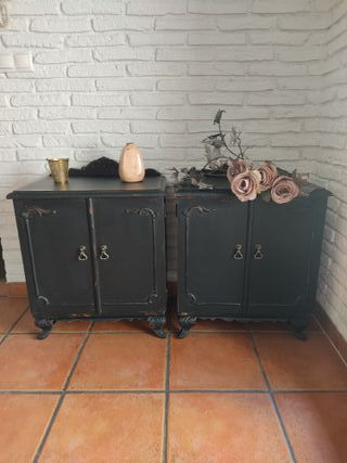 Espectacular pareja de mesillas de noche recién restauradas en color negro, estilo sabby chic romántico francés, desgastadas y acabadas con cera natural pulida. Medidas 72 alto, 57 ancho y 40 fondo. Piezas únicas y exclusivas, ninguna igual. Ideales en cualquier ambiente y estancia. Actualización de cualquier mueble antiguo, mesa, sillas, cabecero, cómoda, aparador, vitrina, mesa tocinera, alacena, armario, estantería, librería, dormitorio, bureau, escritorio, consola, mueble entrada, baño, tv, más cosas en mi perfil.