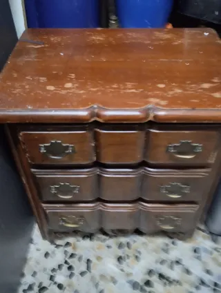 Mesita de noche con 3 cajones que abren y cierran muy bien. Es antigua pero funciona perfectamente solo tiene el desperfecto en la encimera, con pegamento se arregla.