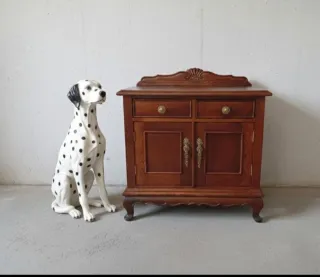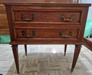 Elegante mesita de noche de estilo antiguo. Un mueble clásico que aporta un toque de distinción a cualquier habitación. - Diseño de dos cajones con tiradores ornamentados. - Patas torneadas que le confieren un aire vintage. - Acabado en tono oscuro. tengo la estructura de la cama la dejo por 40€ recogida en jerez