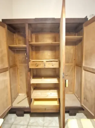 Armario de dormitorio antiguo con un diseño clásico. - Estructura de madera robusta. - Puertas abatibles. - Múltiples estantes interiores. - Cajones inferiores. - dos mesitas de noche - cómoda con espejo y cajones