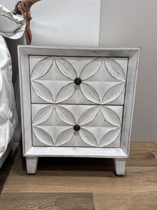 Elegante mesita de noche con un diseño vintage y acabado envejecido. Cuenta con dos cajones para almacenamiento. - Diseño con relieve geométrico en los frentes. - Tiradores redondos de estilo antiguo. - Patas robustas que le dan estabilidad.