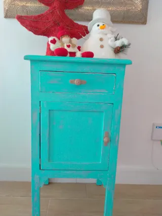 Mesita auxiliar o de noche con un diseño encantador. Su acabado en color teal le da un toque único. Es una mesita antigua de madera (creo que es de nogal) . Está pintada a la tiza y envejecida por una restauradora, porque quería darle un toque de color único. La vendo porque me he mudado a un sitio más pequeño y no tengo espacio, de otro modo, no me desharía de ella. Es sencillamente preciosa. Con la mudanza perdí el "click" de cerrar la puertecita, de ahí el precio. Es algo barato y de fácil solución. Las medidas están en las fotos.