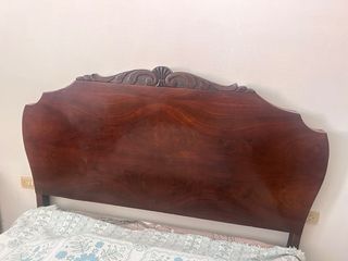 Conjunto de muebles de dormitorio de estilo antiguo. - Cabecero de cama con diseño curvo. - Mesitas de noche a juego con detalles ornamentales. - Estructura de cama robusta.