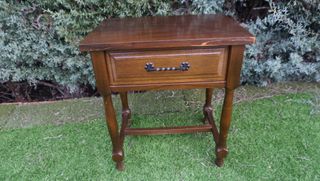 Costó 600€ en Mallorca, tiene 50 años de antigüedad. Elegante mesita de noche de estilo antiguo. Cuenta con un cajón y un estante inferior para mayor capacidad. - Diseño ovalado. - Tirador metálico en el cajón. - Patas torneadas.