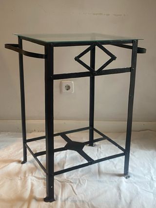 mesa auxiliar de hierro forjado con sobre de cristal. Hecha a partir de un palanganero Muy versatil como mesita auxilar , para libros, revistas , mesilla de noche , o para los perfumes - Diseño vintage. - Estructura robusta de metal. - Encimera de cristal. - Patas con detalles decorativos. En muy buen estado , ha sido restaurada Es de hierro pero no pesa en exceso La vendo por mudanza Medidas Alto 67 cm Ancho 43 cm Largo 35 cm #mesaauxuliardehierro#mesitaantigua #hierro#mesadehierro#antiguedad