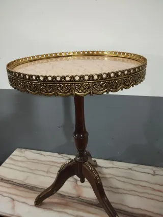 Elegante mesita auxiliar de estilo antiguo. Su diseño combina una base de madera con una tapa de mármol y detalles metálicos dorados. - Base de madera oscura. - Borde metálico ornamentado. - Tapa con veteado de mármol.