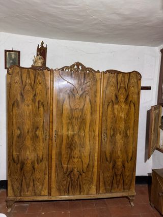 Conjunto de muebles antiguos de madera, ideal para un dormitorio con estilo. - Armario de tres puertas con un diseño tallado. - Mesita de noche a juego. - Cabecero de madera. Medidas del armario aproximadas.