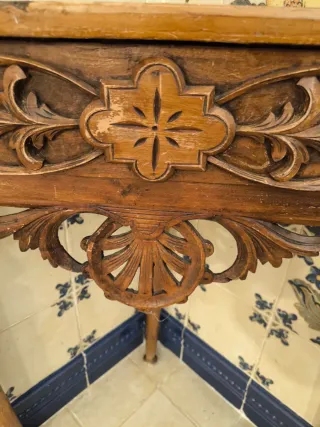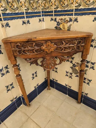 Elegante mesita de esquina antigua con un diseño tallado a mano. 35cm de profundidad, 65cm de ancho y 85cm de alto. No envío, venta en persona. Zona Marbella. - Fabricada en madera. - Tonos marrones y multicolor. - Ideal para espacios pequeños.