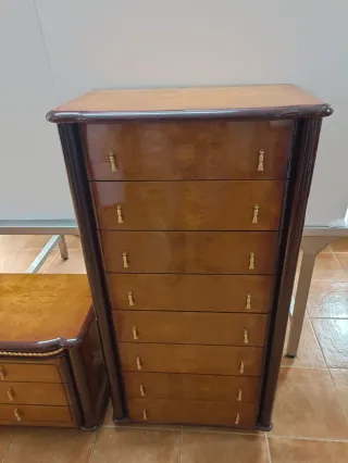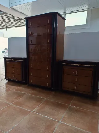 Conjunto de muebles de dormitorio de estilo antiguo, compuesto por una cómoda alta y dos mesitas de 2 dormitorio de 62x40x55 de altura y 1 sifonier de 62x40x120 de alto. Chapado de alta cualidad. Muebles buenos. - Diseño clásico con acabados en madera oscura y detalles brillantes. - Tiradores dorados en cada cajón. - Las mesitas de noche tienen tres cajones cada una. - La cómoda cuenta con seis cajones.