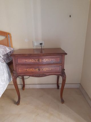 Mesita de noche antigua con un diseño clásico y elegante. Ideal para añadir un toque vintage a tu hogar. - Estructura principal de madera con detalles en marquetería. - Tiradores ornamentales dorados. - Patas curvas con ornamentación. - Requiere restauración.