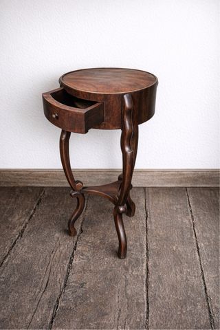 Mesita auxiliar redonda de estilo clásico, realizada en madera maciza, con patas cabriolé y travesaño central. Incorpora un cajón frontal funcional. No tiene carcoma. Tiene un pequeño detalle en un ángulo del cajón. Moble / mueble / cadira/ silla / restaurado / antiguo / antic / mesa / taula / decoración/ decoració / sofá / sillón/ butaca / retro / customizado / vitrina / bufet / buffete/ Ikea / maison du monde / consola / nit / noche / roure/ chene/ iluminación, farolas, foco,