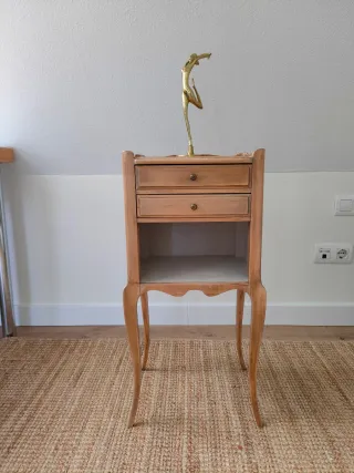 Elegante mesita auxiliar de estilo francés con un acabado de madera lavada. Su diseño curvo y patas estilizadas le dan un toque clásico y refinado. - Dos cajones con tiradores. - Espacio abierto debajo de los cajones. - Acabado en madera clara. - Más mesitas en mi perfil. M 36*27*70 cm alto SI NO REGATEAS LO HECHO EN SERIE NO LO HAGAS CON LO HECHO EN SERIO. Gracias Retro antigua antiguo vintage mesa mueble mesitas pequeña alta dormitorio espejo consola madera natural nueva regalo una consola auxiliar entrada salón coqueta cajonera camarera clásica roble