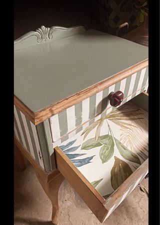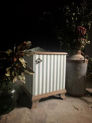 Encantadora mesita auxiliar con un diseño a rayas en verde y blanco. tienes en el perfil la cómoda a juego. Solo una mesilla disponible Un mueble único y con mucha personalidad que quedará precioso en el lugar donde tú elijas. 58 de alto X 48 de ancho X 35 de fondo. Más muebles en nuestro perfil. Si quieres ver nuestros trabajos también puedes visitar nuestro perfil de Instagram los muebles del naufragio. No leer: cómoda, aparador industrial, vitrina a la cena, mueble antiguo, muebles restaurados, decoración interiores, escaparatismo Zara Home sinfonía buró . Se alquilan muebles para eventos o rodajes