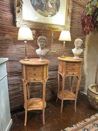 Pareja de mesitas antiguas francesas de raíz con acabado natural, 3 cajones y una balda. Diámetro 32 Alto 72 Nos encontrarás en nuestra tienda Benezit de 400m2 situada en la calle Castillo Piñeiro, 8 (junto al hospital De la Cruz Roja de Reina Victoria). Tlf: 915348348 LLAMAR ANTES PARA CITA PREVIA. muebles,lámparas,pintado,decapado,mesitas de noche,mesas de centro,antigüedades,clásico,madera natural,lacado,metal,mesas de comedor a medida,sillas,sillones,espejos,mesas auxiliares,cómodas,consolas,boho,shabby chic,retro,archivadores,provenzal, roble,rústico