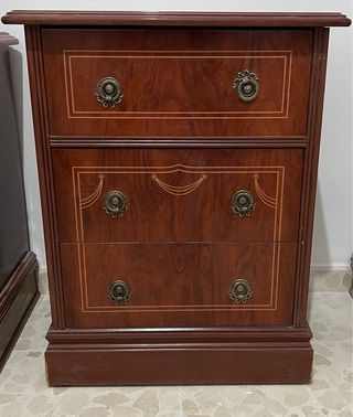 Elegante mesita de noche de estilo antiguo, perfecta para añadir un toque clásico a tu dormitorio. - Tres cajones con tiradores ornamentados. - Diseño de madera con acabados detallados. - Estructura robusta y duradera. Se encuentra en buen estado, para cualquier cosa contactar por chat.